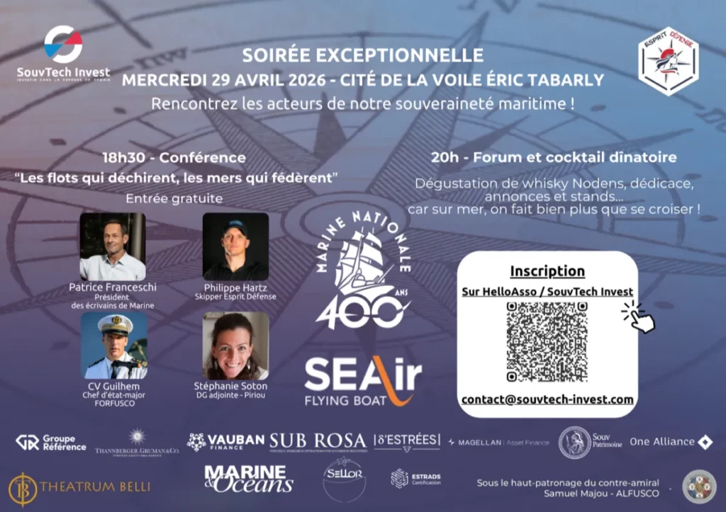 Le 29 avril à la Cité de la Voile de Lorient, SUB ROSA s’associe à SouvTech Invest et son collectif de spécialistes de la Défense, pour une soirée exceptionnelle réunissant les acteurs engagés dans notre souveraineté maritime, sous le haut patronage du contre-amiral Samuel Majou, commandant de la FORFUSCO.